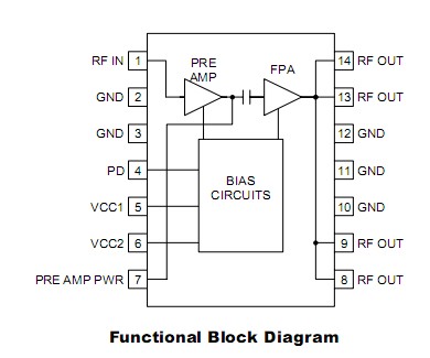 RF2103P absolute maximum ratings: (1)Supply Voltage: -0.5 to +7.5 VDC; (2)Power Down Voltage (VPD): -0.5 to+5 V; (3)DC Supply Current: 350 mA; (4)Input RF Power: +12 dBm; (5)Output Load VSWR: 10:1; (6)Operating Case Temperature: -40 to +100℃; (7)Operating Ambient Temperature: -40 to +85℃; (8)Storage Temperature: -40 to +150℃.