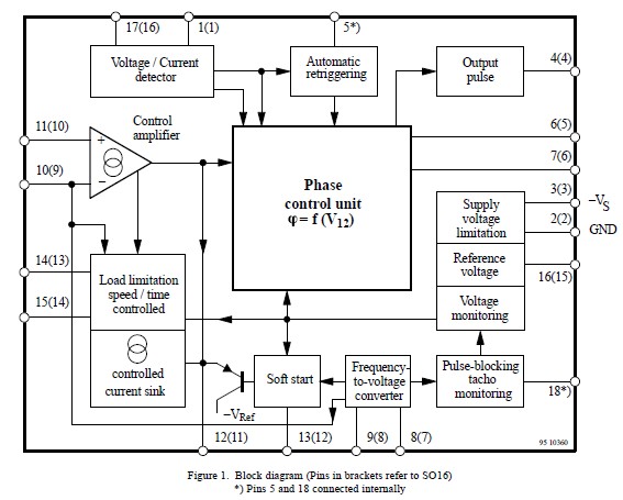 U211B features: (1)Internal frequency-to-voltage converter; (2)Externally-controlled integrated amplifier; (3)Overload limitation with a fold back characteristic; (4)Optimized soft-start function; (5)Tacho monitoring for shorted and open loop; (6)Automatic retriggering switchable; (7)Triggering pulse typ. 155 mA; (8)Voltage and current synchronization; (9)Internal supply-voltage monitoring; (10)Temperature reference source; (11)Current requirement≤ 3 mA.